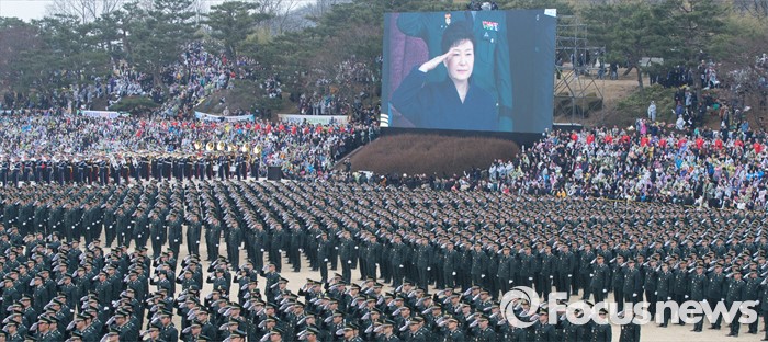 (계룡=포커스뉴스) 4일 오후 충남 계룡대 연병장에서 열린 2016년 장교 합동임관식에서 신임장교들이 박근혜 대통령에게 거수경례를 하고 있다.