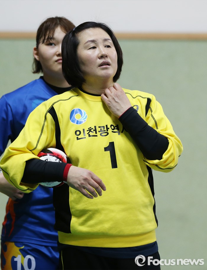 인천=포커스뉴스) 4일 인천선학체육관에서 열린 2016 SK 핸드볼 코리아리그 여자부 인천시청-광주도시공사 경기에서 44세의 현역 최고령 선수인 인천시청 골키퍼 오영란이 경기 개시를 기다리고 있다.