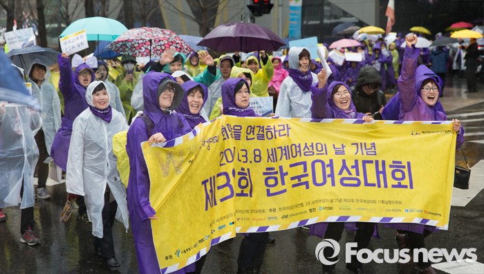 (서울=포커스뉴스) 5일 오후 세계여성의날(3월8일) 기념 제32회 한국여성대회를 마친 참가자들이 서울 종로구 일본대사관을 향해 행진하고 있다.
