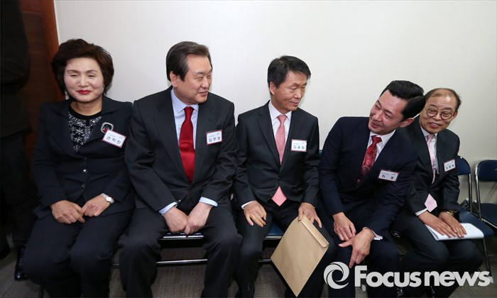 (서울=포커스뉴스) 부산 중구·영도구에 출마하는 김무성 새누리당 대표가 6일 오전 서울 여의도 당사에 마련된 공천 심사 면접장 앞에서 예비후보들과 대기하고 있다.