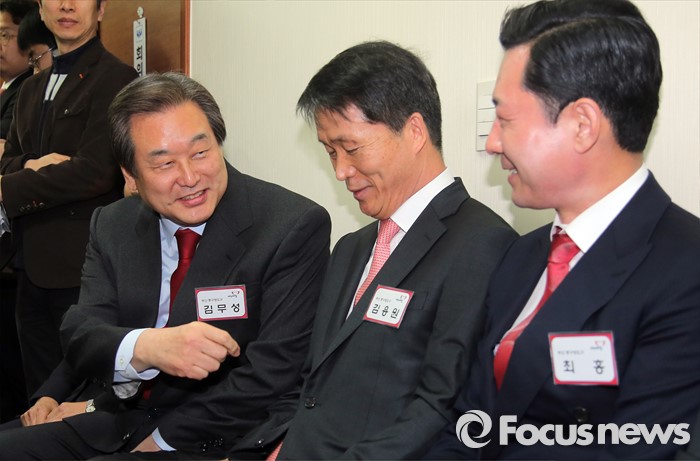 (서울=포커스뉴스) 부산 중구영도구에 출마하는 새누리당 김무성 대표가 6일 오전 서울 여의도 당사에서 열린 선거구변경지역 1일차 공천신청자 면접을 기다리며 예비후보자 들과 대화하고 있다. 왼쪽부터 김무성, 김용원, 최홍.