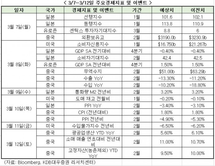 이번주 주목할 이벤트와 경제지표는 ▲중국의 2월 수출입 동향 발표(8일) ▲유럽중앙은행(ECB) 통화정책회의(10일) 등이 있다.