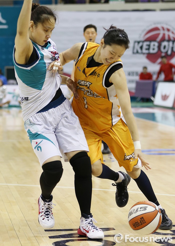(부천=포커스뉴스) 6일 부천체육관에서 열린 2015-2016 여자프로농구 정규리그 마지막 경기 KEB하나은행-KB스타즈 경기에서 KB스타즈 홍아란이 KEB하나 염윤아의 마크를 제치며 돌파를 시도하고 있다.