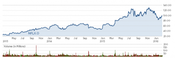 넷플릭스 주가는 이 같은 수준 높은 콘텐츠의 자체 제작으로 지난 2015년 주가는 두 배 이상 치솟으며 사상 최고치를 돌파하기도 했다.