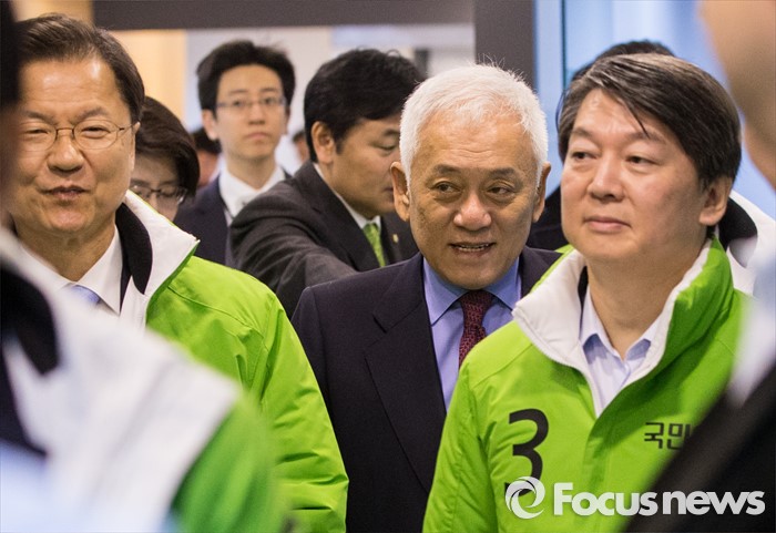 (서울=포커스뉴스) 7일 오전 서울 마포구 당사에서 열린 선거대책위원회의에 천정배(왼쪽부터), 안철수 국민의당 공동대표, 김한길 상임 선대위원장이 참석하고 있다.