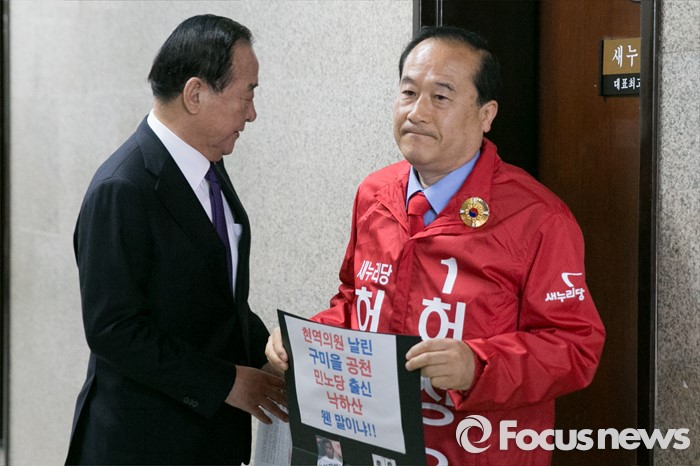 (서울=포커스뉴스) 허성우(오른쪽) 새누리당 예비후보가 7일 오전 서울 여의도 국회 새누리당 대표최고위원실 앞에서 구미을 공천 탈락과 관련해, 피켓 시위를 하는 동안, 서청원 최고위원이 최고위원회의에 참석하고 있다.