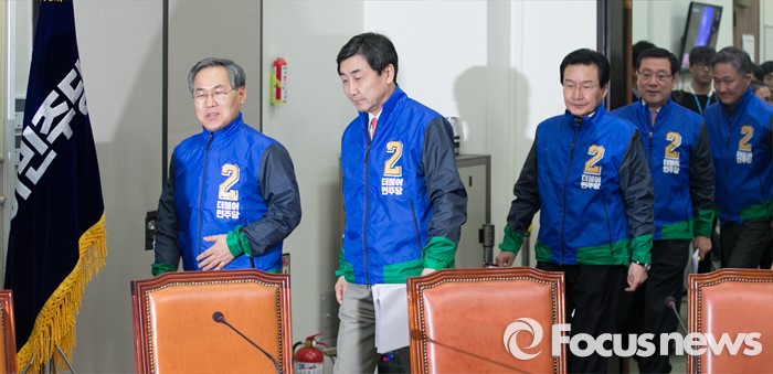 (서울=포커스뉴스) 이종걸 더불어민주당 원내대표와 비대위원들이 7일 오전 서울 여의도 국회에서 열린 비상대책위원회의에 20대 총선용 유니폼을 입고 참석하고 있다. 왼쪽부터 우윤근 비대위원, 이 원내대표, 변재일, 이용섭, 표창원 비대위원.