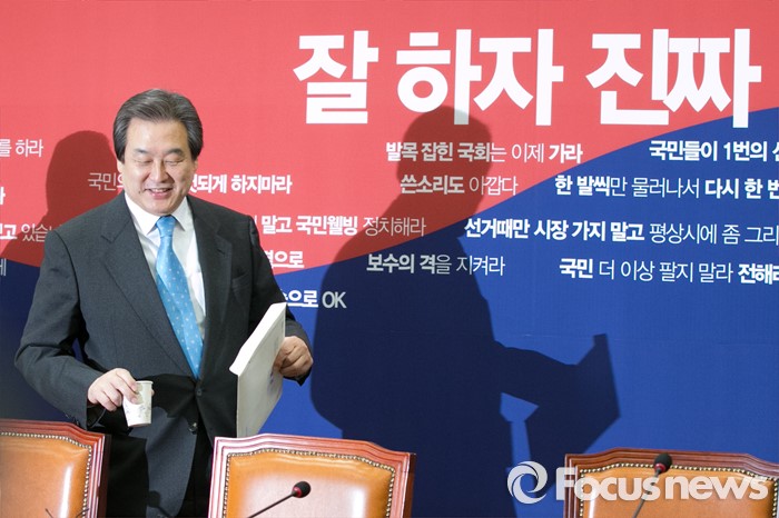 (서울=포커스뉴스) 김무성 새누리당 대표가 7일 오전 서울 여의도 국회에서 열린 최고위원회의에 참석하며, 배경 문구를 보며 미소짓고 있다.