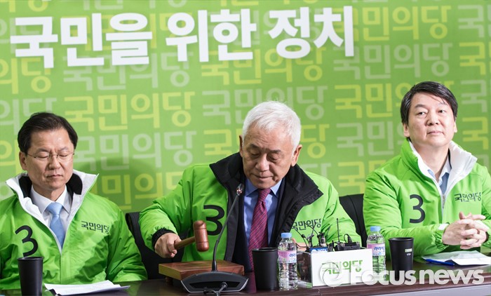 천 공동대표는 "새누리당의 압석 저지를 위해 당 내부에서 활발한 질서 있는 토론이 필요하다"고 거듭 강조했다.7일 오전 서울 마포구 당사에서 열린 선거대책위원회의에 참석한 김한길(가운데) 국민의당 상임 선대위원장이 의사봉을 두드리고 있다. 2016.03.07 양지웅 기자
