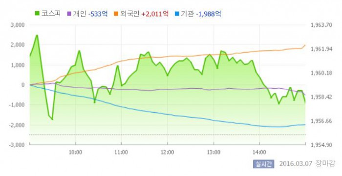 7일 코스피지수는 전거래일 대비 0.11%(2.24포인트) 오른 1957.87에 장을 마쳤다. 코스닥지수는 전거래일 보다 0.24%(1.63포인트) 내린 672.21에 마감했다.