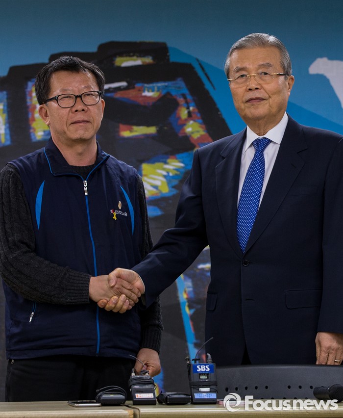(서울=포커스뉴스) 7일 오후 서울 중구 민주노총을 방문한 김종인(오른쪽) 더불어민주당 비상대책위원회 대표가 최종진 민주노총 위원장직무대행을 만나 악수하고 있다.