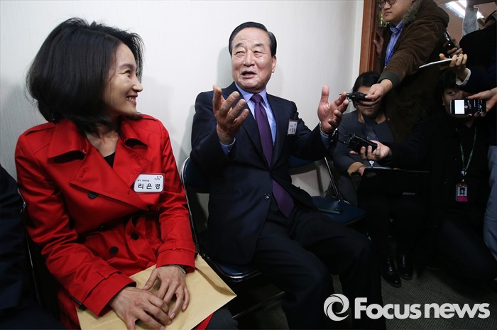 (서울=포커스뉴스) 서청원 새누리당 최고위원(경기 화성갑)이 7일 오후 서울 여의도 당사에서 열린 공천 면접에서 입장을 기다리며 경쟁자인 리은경 예비후보와 대화를 나누고 있다.