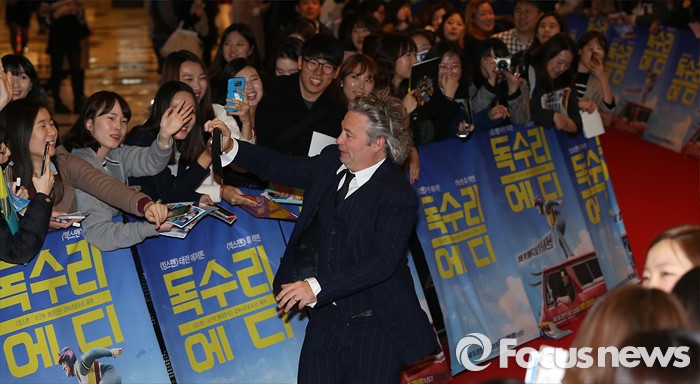(서울=포커스뉴스) 7일 오후 서울 영등포구 IFC몰 광장에서 열린 영화 '독수리 에디' 레드카펫 행사에 참석한 덱스터 플레처 감독이 휴대전화를 이용해 팬들을 촬영하고 있다.