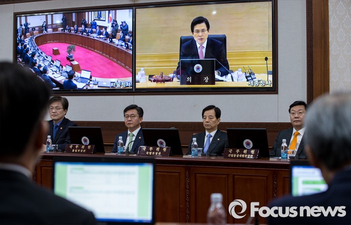 (서울=포커스뉴스) 8일 오전 서울 종로구 정부서울청사에서 열린 국무회의에 황교안 국무총리의 모두발언이 화상을 통해 전달되고 있다.