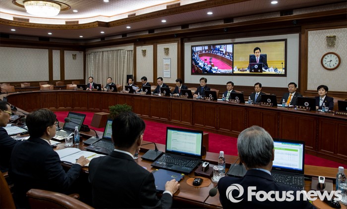 (서울=포커스뉴스) 8일 오전 서울 종로구 정부서울청사에서 열린 국무회의에 황교안 국무총리의 모두발언이 화상을 통해 전달되고 있다.