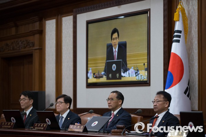 (서울=포커스뉴스) 황교안 국무총리가 8일 오전 정부서울청사에서 열린 국무회의에 화상을 통해 참석하고 있다. 2016-03-08