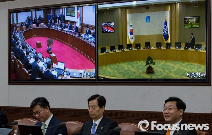(서울=포커스뉴스) 8일 오전 서울 종로구 정부서울청사 국무회의실 모니터에 서울과 세종시의 모습이 대조를 이루고 있다.