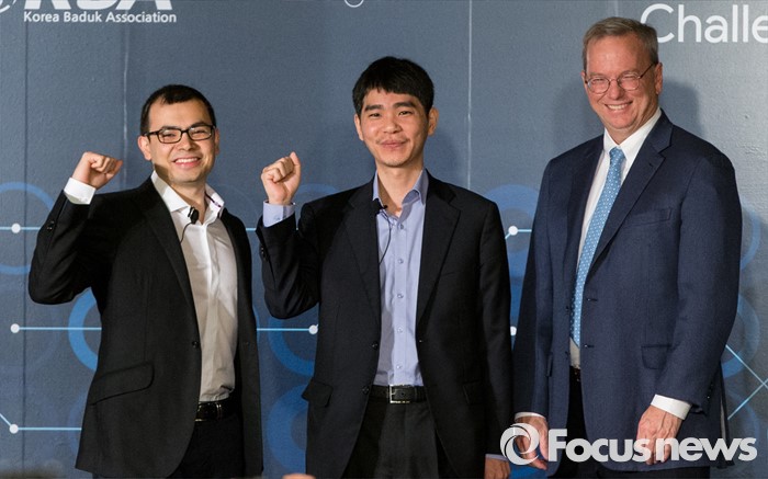 (서울=포커스뉴스) 8일 오전 서울 종로구 새문안로 포시즌스호텔에서 열린 '구글 딥마인드 챌린지 매치' 내ㆍ외신 합동 기자회견에 참석한 데미스 하사비스(왼쪽부터) 구글 딥마인드 최고경영자, 이세돌 9단, 에릭 슈미트 구글 회장이 포즈를 취하고 있다.