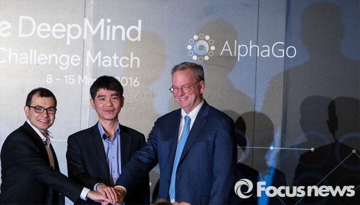 (서울=포커스뉴스) 8일 오전 서울 종로구 새문안로 포시즌스호텔에서 열린 '구글 딥마인드 챌린지 매치' 내ㆍ외신 합동 기자회견에 참석한 데미스 하사비스(왼쪽부터) 구글 딥마인드 최고경영자, 이세돌 9단, 에릭 슈미트 구글 회장이 포즈를 취하고 있다.