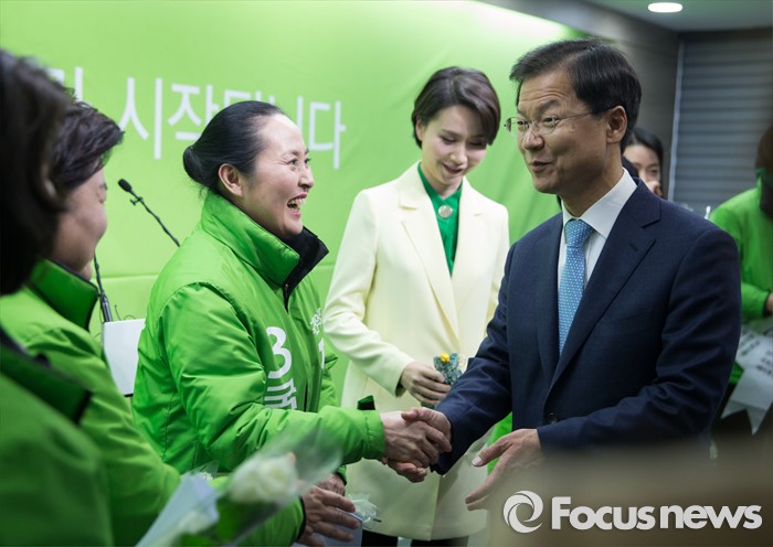 (서울=포커스뉴스) 국민의당 천정배 공동대표가 8일 오후 서울 마포구 국민의당 당사에서 여성 정책발표를 마친 후 여성 예비후보들에게 꽃을 선물하고 있다.