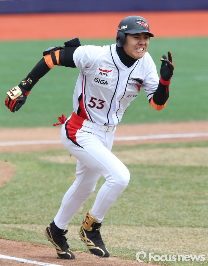 (수원=포커스뉴스) 8일 수원 kt위즈파크에서 열린 2016 KBO리그 시범경기 두산-kt 경기에서 1회말 1사후 kt 이대형이 3루수앞 땅볼을 치고 1루로 전력질주하고 있다. 이대형은 1루에서 세이프되면서 내야안타를 기록.
