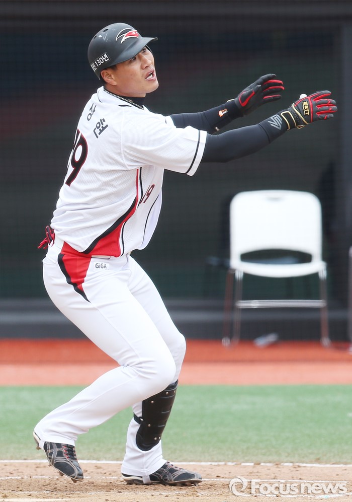 (수원=포커스뉴스) 8일 수원 kt위즈파크에서 열린 2016 KBO리그 시범경기 두산-kt 경기에서 3회 kt 김상현이 연타석 우중월 솔로 홈런을 날리고 타구를 바라보고 있다.
