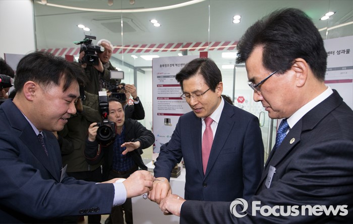 (청주=포커스뉴스) 황교안 국무총리가 8일 오후 충북 청주시 청원구 오창읍 충북창조경제혁신센터를 방문, 이시종(오른쪽) 충북지사와 함께 화장품 제조기업의 제품을 체험하고 있다.