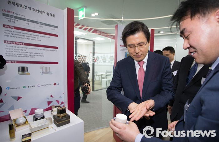 (청주=포커스뉴스) 황교안 국무총리가 8일 오후 충북 청주시 청원구 오창읍 충북창조경제혁신센터를 방문, 화장품 제조기업의 제품을 체험하고 있다.