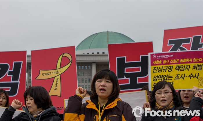 (서울=포커스뉴스) 8일 오후 서울 영등포구 국회 앞에서 열린 '19대 국회 세월호 특별법 개정안 특검 처리 촉구 기자회견'에 참석한 4.16가족협의회 및 관련 시민단체 관계자들이 정부에 세월호 참사 특검처리 약속 이행을 촉구 하고 있다.