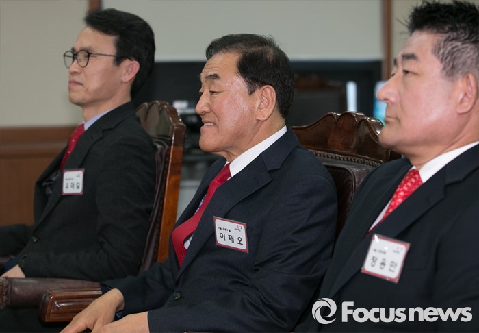 (서울=포커스뉴스) 8일 오후 서울 여의도 새누리당사에서 열린 20대 총선 분구·통합·경계조정 지역구 공천신청자 면접에 서울 은평을에 신청한 이재오 의원과 예비후보들이 공관위원들의 질문에 답하고 있다. 왼쪽부터 유재길 예비후보, 이 의원, 정용만 예비후보.