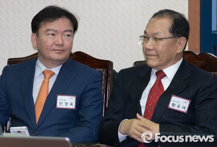 (서울=포커스뉴스) 8일 오후 서울 여의도 새누리당사에서 열린 20대 총선 분구·통합·경계조정 지역구 공천신청자 면접에 인천 연수구갑에 신청한 황우여(오른쪽) 의원과 인천 연수을에 신청한 민경욱 전 청와대 대변인이 면접을 기다리고 있다.
