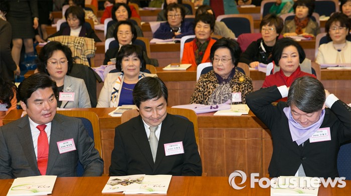 (서울=포커스뉴스) 8일 오후 서울 여의도 국회 헌정기념관에서 열린 세계 여성의 날 기념대회에 참석한 안철수 국민의당 상임공동대표가 퍼포먼스용 스카프를 매고 있다. 왼쪽부터 원유철 새누리당 원내대표, 이종걸 더불어민주당 원내대표, 안 상임공동대표.