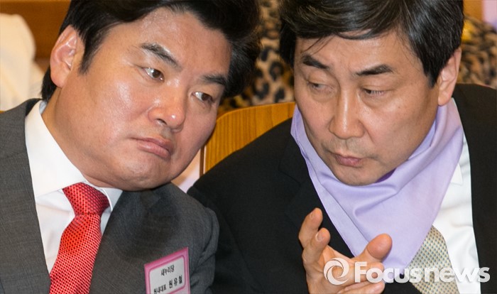 (서울=포커스뉴스) 8일 오후 서울 여의도 국회 헌정기념관에서 열린 세계 여성의 날 기념대회에 참석한 원유철(왼쪽) 새누리당 원내대표와 이종걸 더불어민주당 원내대표가 대화하고 있다.