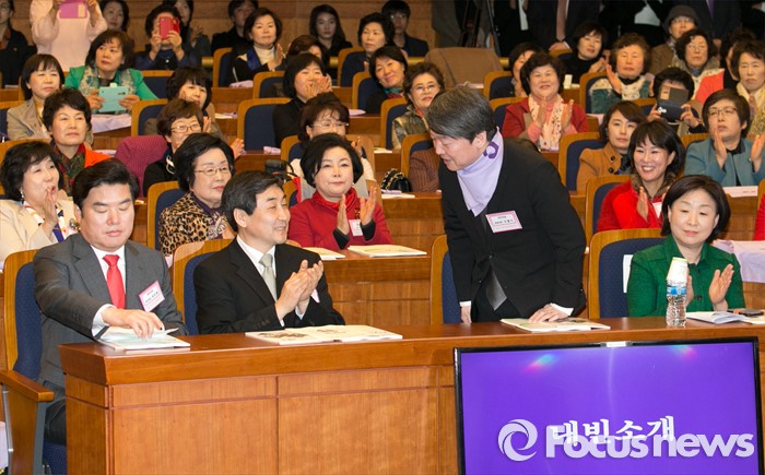(서울=포커스뉴스) 8일 오후 서울 여의도 국회 헌정기념관에서 열린 세계 여성의 날 기념대회에 참석한 안철수 국민의당 상임공동대표가 내빈소개에 일어나 인사하고 있다. 왼쪽부터 원유철 새누리당 원내대표, 이종걸 더불어민주당 원내대표, 안 상임공동대표, 심상정 정의당 상임대표.