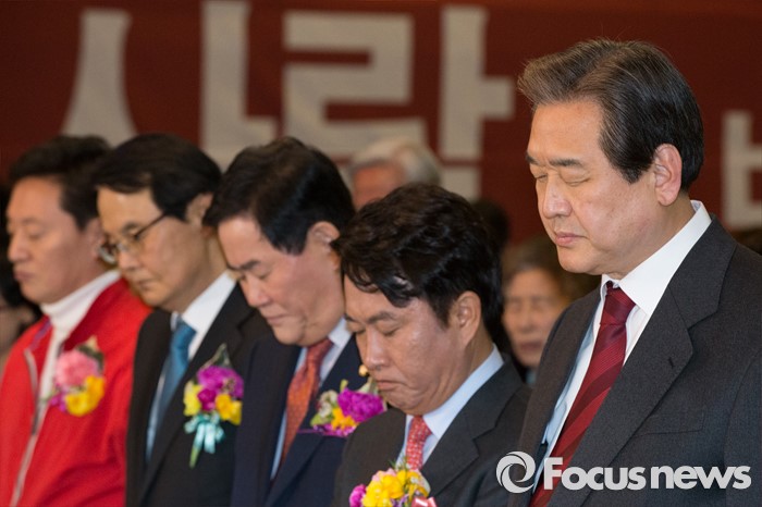 (서울=포커스뉴스) 김무성(오른쪽) 새누리당 대표와 최경환(오른쪽 세번째) 새누리당 의원이 8일 오후 서울 마포구 신촌 케이터틀 컨벤션홀에서 열린 새누리당 서울시당 서대문갑 당원교육 및 전진대회에 참석해 묵념을 하고 있다.