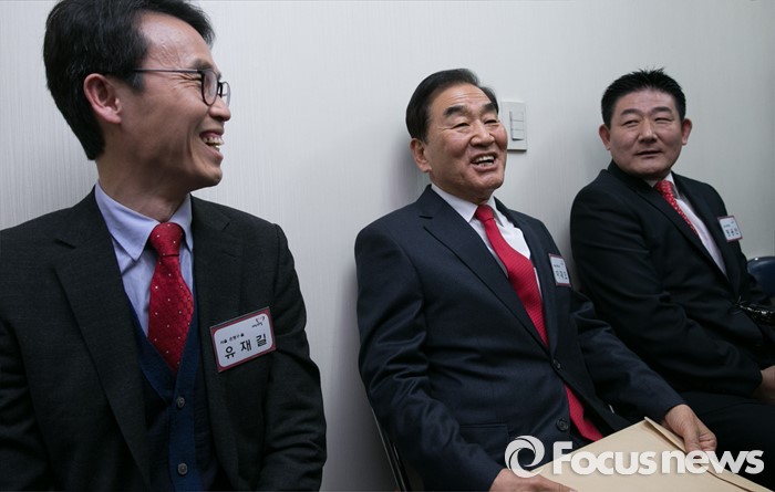 (서울=포커스뉴스) 8일 오후 서울 여의도 새누리당사에서 열린 20대 총선 분구·통합·경계조정 지역구 공천신청자 면접에 서울 은평을에 신청한 이재오 의원이 참석해 예비후보들과 함께 기다리고 있다. 왼쪽부터 유재길 예비후보, 이 의원, 정용만 예비후보.