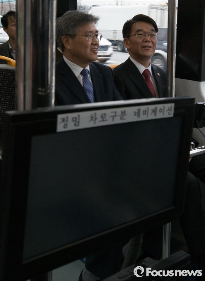 (청주=포커스뉴스) 강호인 국토교통부 장관이 8일 오후 청주시 청원구 오창읍 충북테크노파크에서 열린 차세대 도로교통용 정밀위성항법(GPS) 시연회에서 정밀차로구분 네비게이션이 설치된 바이모달트램을 시승 하고 있다.