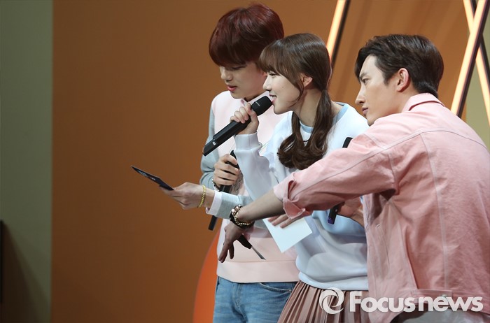 (서울=포커스뉴스) 8일 오후 서울 마포구 SBS프리즘 타워에서 열린 '2016 더쇼 62회' 생방송 촬영 현장에서 진행자로 참석한 영재(왼쪽부터), 예린, 조미가 참가 가수를 소개하고 있다.