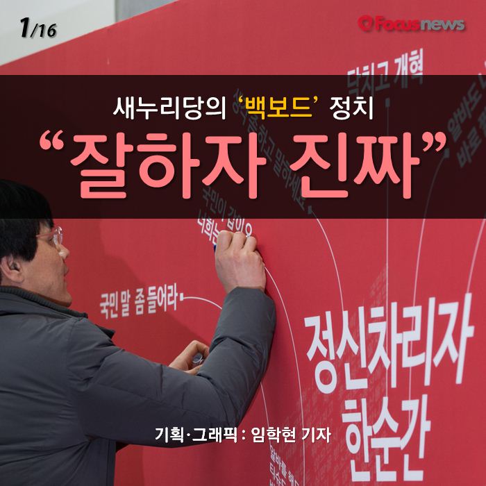 (서울=포커스뉴스) 새누리당 대표회의실에 새로운 '백보드'가 놓이면서, 그 속의 문구들이 언론의 조명을 받았습니다. "정신 차리자. 한 순간 훅 간다" 와 "잘하자 진짜" 같은 도발적인 내용이 꽤 많았는데요. 그 많은 문장들이 실제로 어떤 내용의 것들인지, 포커스뉴스가 확인해 보았습니다.