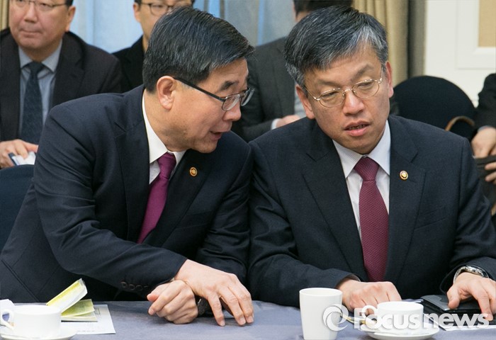 (서울=포커스뉴스) 9일 오전 서울 여의도 국회 귀빈식당에서 경제활성화를 위한 민·당·정 간담회에 앞서 이기권(왼쪽) 고용노동부 장관과 최상목 기획재정부 1차관이 대화하고 있다.