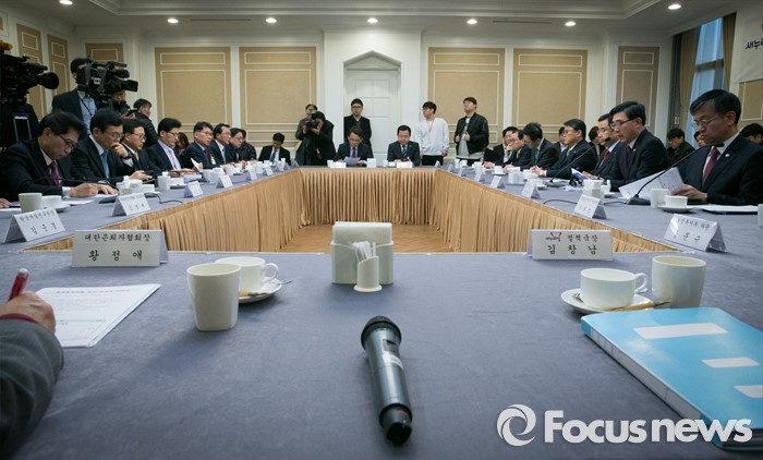 (서울=포커스뉴스) 9일 오전 서울 여의도 국회 귀빈식당에서 경제활성화를 위한 민·당·정 간담회가 진행되고 있다. 이날 간담회에는 김정훈 새누리당 정책위의장, 조원진 원내수석부대표, 이기권 고용노동부 장관, 최상목 기획재정부 1차관, 이동근 대한상의 상근부회장, 이승철 전경련 상근부회장 등이 참석했다.