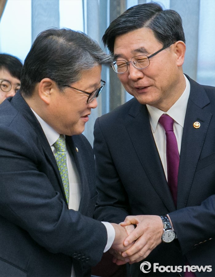 | △ 인사하는 이기권 장관-조원진 원내수석 |