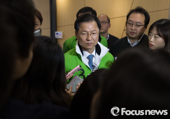 (서울=포커스뉴스) 9일 오전 서울 마포구 국민의당 당사에서 선거대책회의를 마친 천정배 상임공동대표가 기자들에게 야권통합, 야권연대에 관한 질문을 받고 있다.