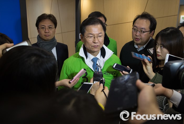 (서울=포커스뉴스) 9일 오전 서울 마포구 국민의당 당사에서 선거대책회의를 마친 천정배 상임공동대표가 기자들에게 야권통합, 야권연대에 관한 질문을 받고 있다.