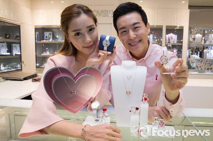 (서울=포커스뉴스) 9일 오전 중구 롯데백화점 본점에서 스와로브스키(SWAROVSKI)의 '화이트데이 컬렉션'을 모델들이 선보이고 있다. 제품은 디어(Dear) 네크리스와 뱅글, 블로우(Blow) 이어링, 데이타임(Daytime) 워치로 구성되어 있다.