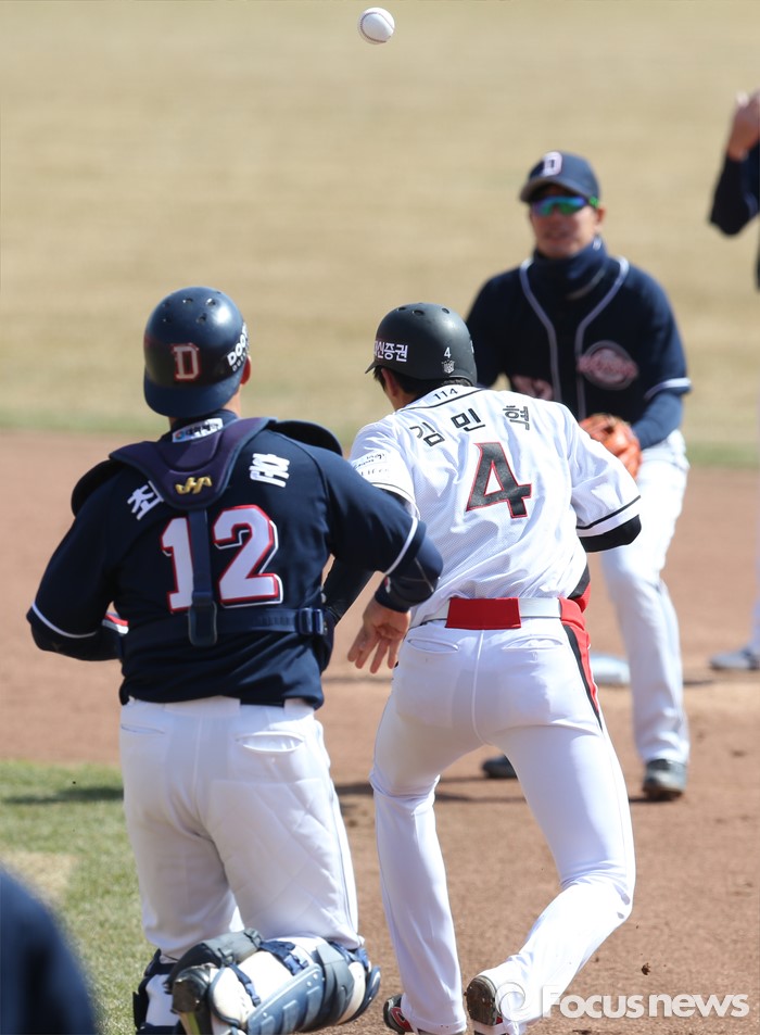 (수원=포커스뉴스) 9일 수원 kt위즈파크에서 열린 2016 KBO리그 시범경기 두산-kt 경기에서 1회말 무사 1,2루에서 kt 1루주자 김민혁이 협살에 걸려 두산 포수 최재훈과 유격수 김재호 사이를 뛰고 있다.