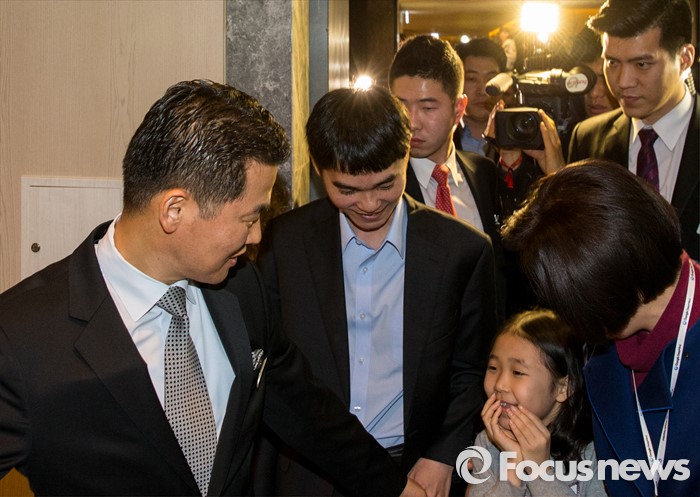 (서울=포커스뉴스) 9일 오후 서울 종로구 포시즌스 호텔에서 열린 '구글 딥마인드 챌린지 매치'에서 이세돌 9단이 딸 혜림양과 함께 대국장으로 향하고 있다.