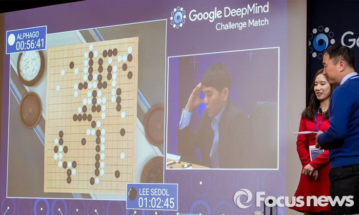 (서울=포커스뉴스) 9일 오후 서울 종로구 포시즌스 호텔에서 열린 이세돌 9단과 알파고의 대국 '구글 딥마인드 챌린지 매치'에서 해설진이 알파고의 백90수(좌하귀)가 실착임을 설명하고 있다.