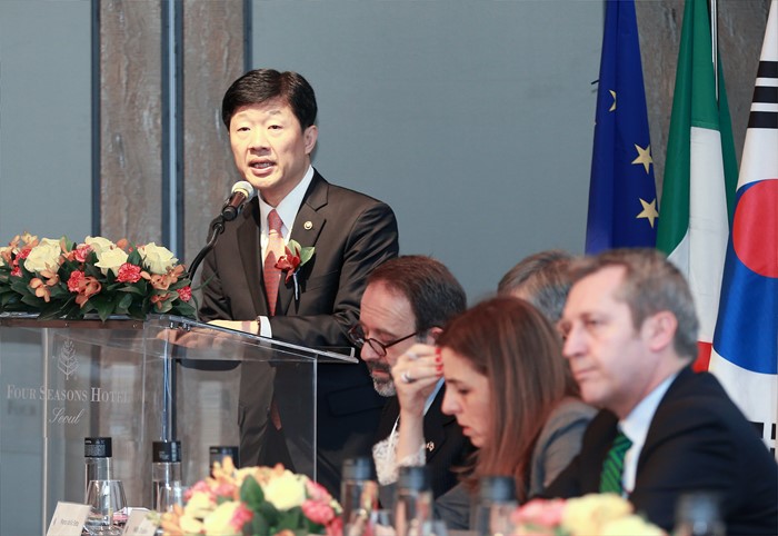 (서울=포커스뉴스) 우태희 산업통상자원부 2차관이 9일 오전 서울 종로구 포시즌호텔 그랜드볼룸에서 열린 한-이탈리아 비즈니스 포럼에 참석해 인사말을 하고 있다. <사진제공=산업통상자원부>