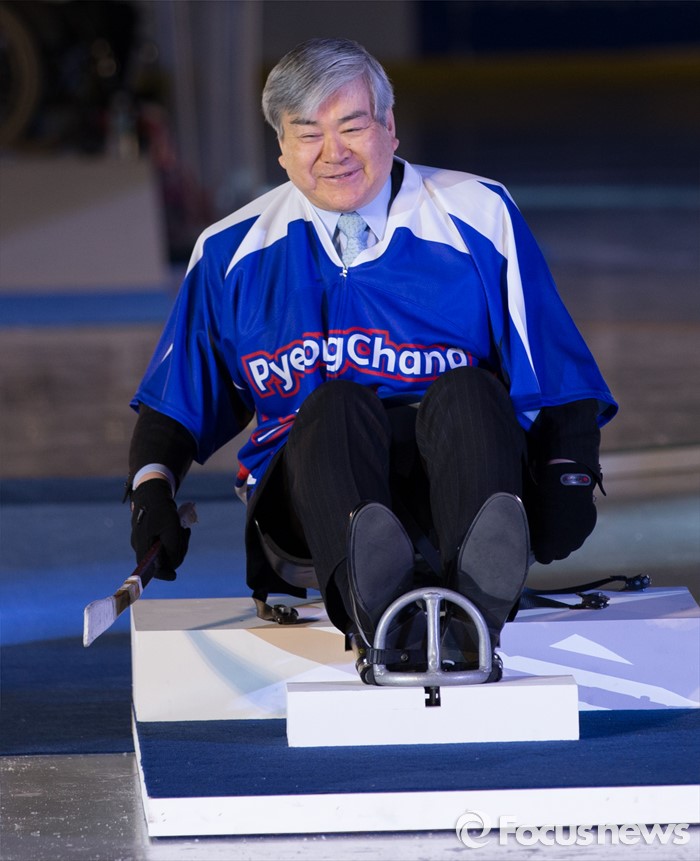 | △ 아이스슬레지하키 시타하는 조양호 위원장 |